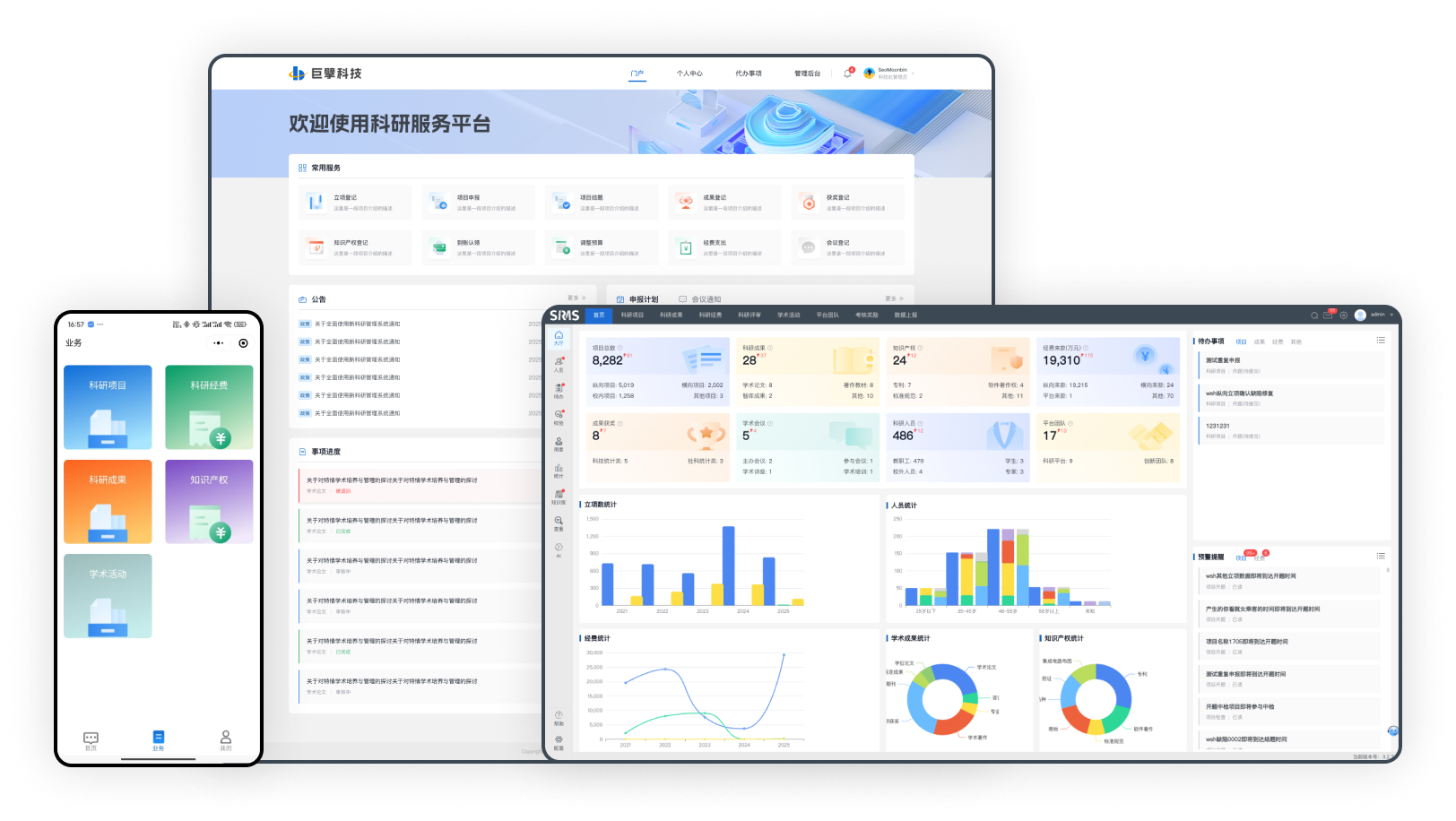 随着我国R&D不断发展、政府对R&D的投⼊和关注⽇益增加,科研管理流程标准化、科研管理信息化、管理⼯具数智化的需求不断溢出,巨擘科技⾃主研发的科研综合管理平台(下⽂简称“SRMS”)以提升科研管理效率、释放科研管理效能、节约科研成本和促进科研产出为⽬标,不断为客⼾提供深 度服务和创造价值。