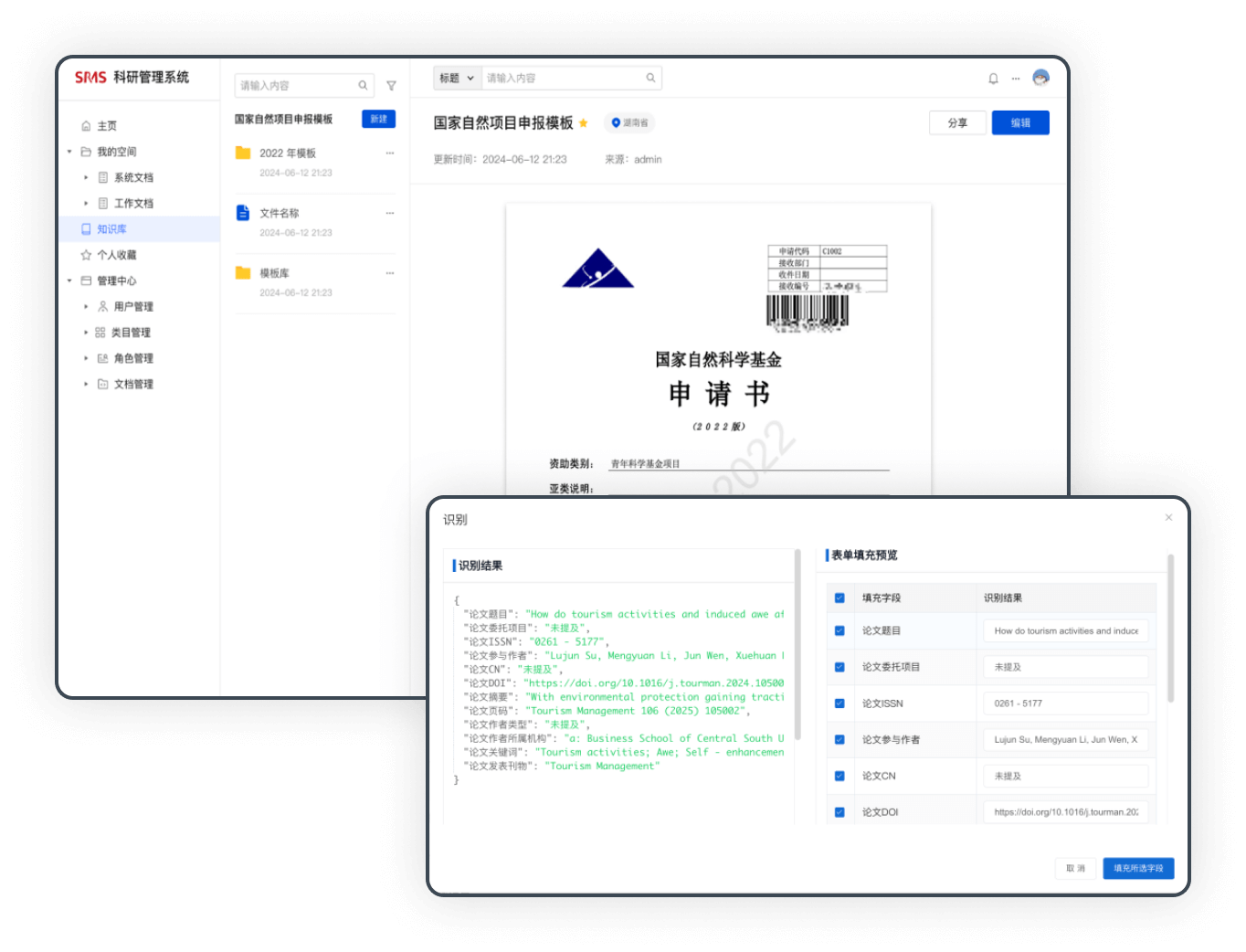 ⽀持纵向项⽬、论⽂、专利、著作和合同等各类科研资料 OCR 识别和录⼊,⽂字信息精准识别和格式,并⽀持修正和调整,在⼤幅减少录⼊时间的同时还提⾼数据收集的准确性与效率。