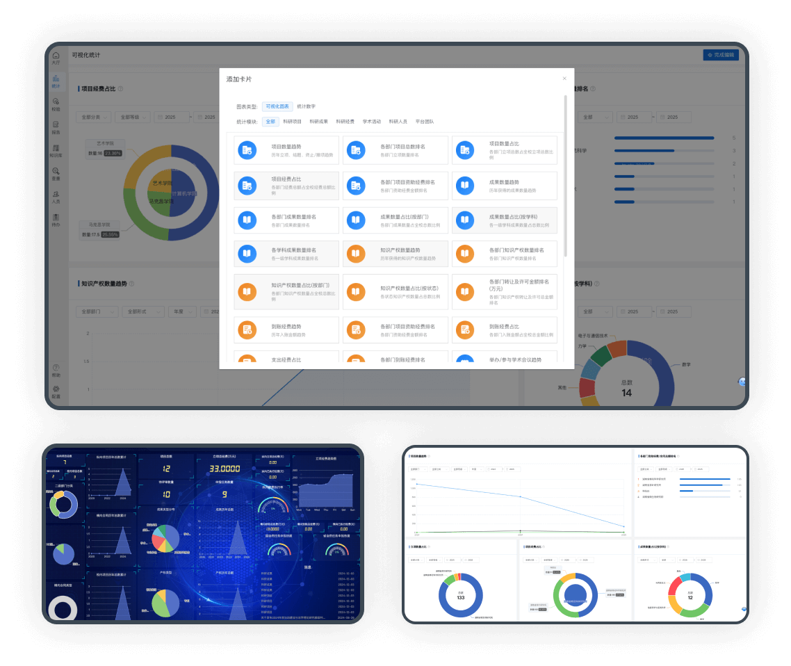 提供丰富的100+可视化统计图表,⽀持BI图表⾃定义配置展⽰,配有独⽴的数据驾驶舱⼤屏,多维度、多场景可视化展⽰科研业务数据,为管理决策者提供直观、丰富的可视化决策依据。
