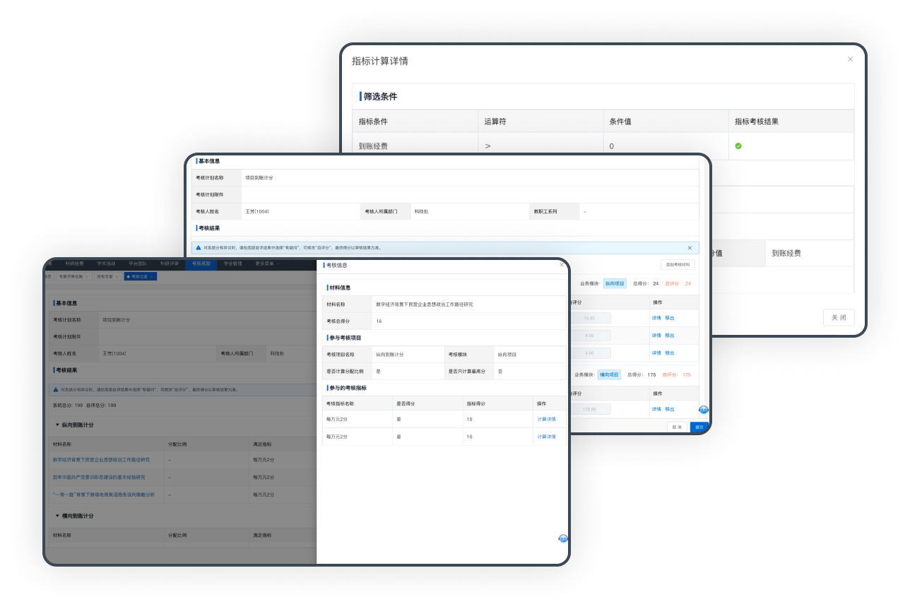 200+指标维度、多层级结构的考核指标⾃定义设置,直观可视的考核结果报告⽣成,助⼒科研管理⼈员轻松完成科研考核任务,辅助科研⼈员清晰查阅考核结果。