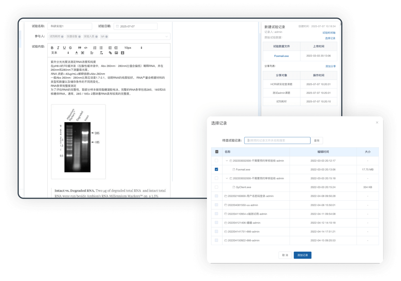 在传统的实验室业务管理基础之上,充分结合电⼦试验记录本并与课题项⽬、试剂耗材和试验数据深度关联结合,进⼀步加强了实验室科研活动的协同能⼒和深度,同时还进⼀步加强了试验数据和记录的管理。