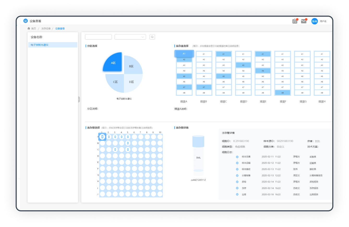 平台通过前端信息化技术对样本运输、制备和存储进行可视化渲染,在便利科研工作者对样本管理基础上,可视化的丰富、直观的数据图表也为实验室的整体管理提供分析和决策的数据依据。