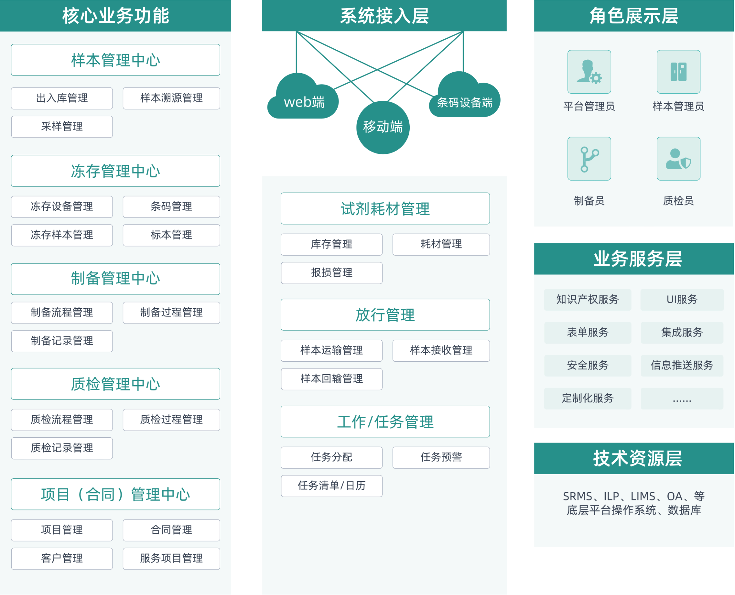 平台支持集成“条码打印机”、“条码扫描器”、“PDA”、“温湿度传感器”、“GPS定位”等终端智能设备,实时采集和管理样本数据,为样本管理平台的可拓展性和兼容性提供有力的保障。